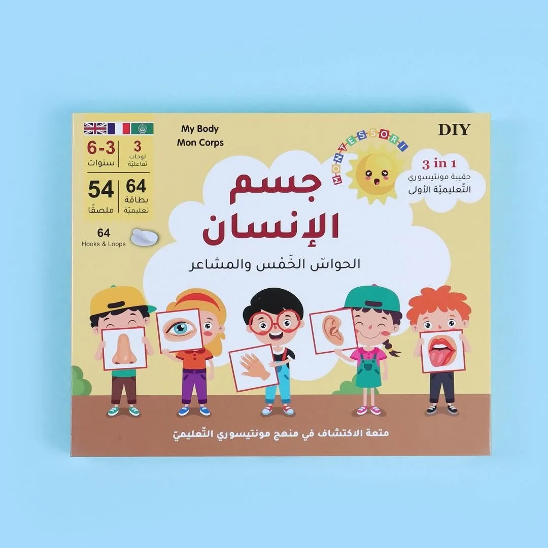 54 ملصقا يتضمن أسماء أعضاء الجسم والمشاعر باللغات الثلاث (عربي - انجليزي - فرنسي).